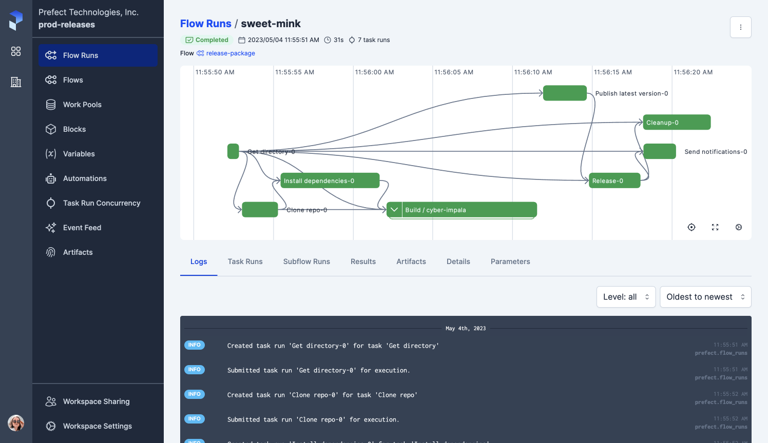 Prefect is a modern workflow orchestration platform designed to build, run, and monitor data pipelines with minimal overhead. It offers both CLI and UI interfaces and focuses on a developer-friendly experience by allowing workflows to be written directly in Python without rigid DAG constraints.